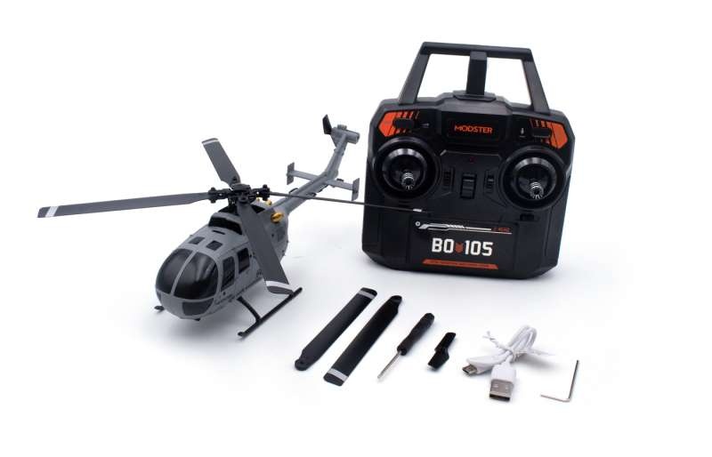 Scope of delivery: 1x Modster BO105 RTF 1x Modster 2.4 GHz remote control 1x Lipo battery 7.4V 380mAh 1x USB charger 1x spare rotor blades 1x instruction manual (German/English)