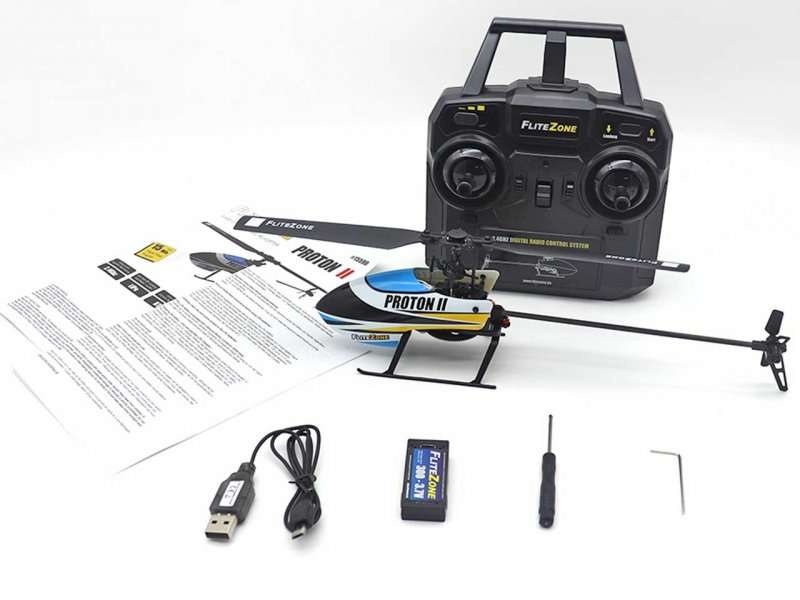 Scope of delivery Proton Helicopter ready to fly FliteZone remote control transmitter FliteZone LiPo battery 300mAh USB charging cable Instruction manual German/English